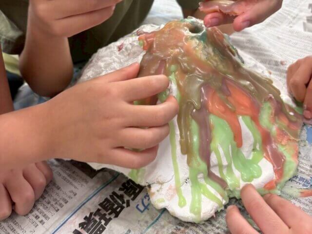 まずはチョコレートを湯せんで溶かし、赤・青・緑などの食紅を混ぜてマグマに見立てます。子どもたちは「わたし赤!」「こっちは緑にしたい!」と大盛り上がり。