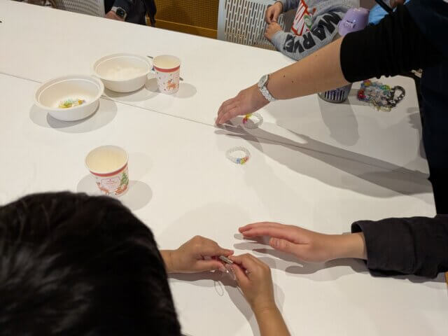 好きな色のビーズを選びながら、自分だけのアクセサリーを完成させました。