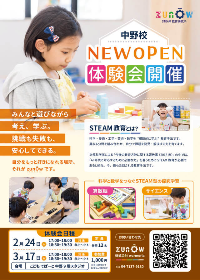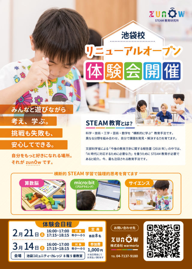 zunŌw(ズノー)のコンセプトは、“アソビとマナビで探究する次世代型教室”。STEAM教育をベースに、算数・プログラミング・ロボット・サイエンス・アートなど、分野横断的にさまざまな探究をしていきます。